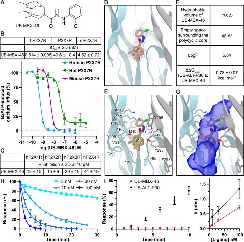 I am delighted to share our latest publication, “A polycyclic scaffold identified by structure-based drug design effectively inhibits the human P2X7 receptor,” now published in Nature Communications. The study combines high-resolution cryo-EM, functional pharmacology, and molecular dynamics to uncover human-specific structural features of the P2X7 receptor and to design UB-MBX-46, a highly selective, sub-nanomolar antagonist of human P2X7.